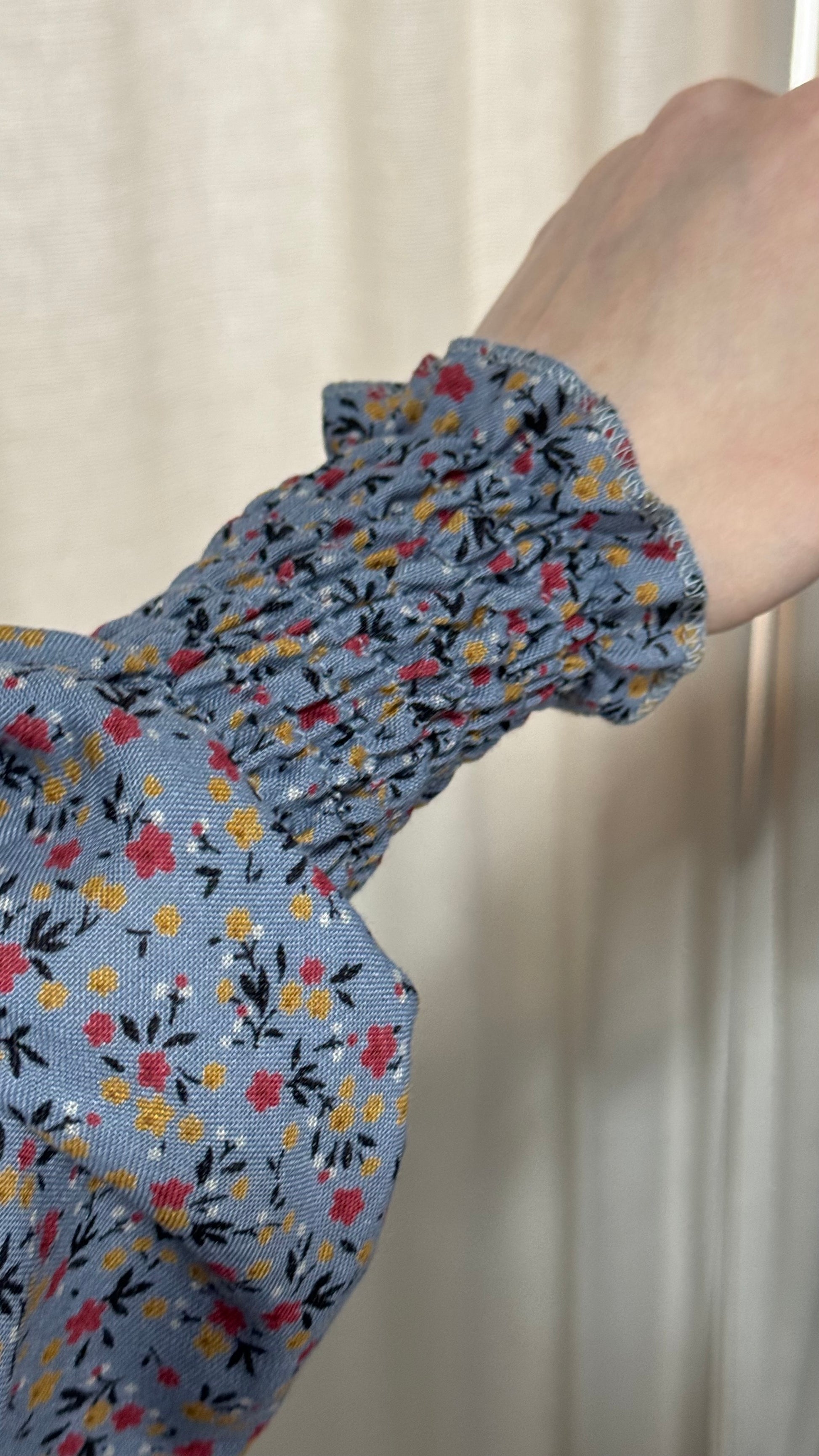 - Blue with red and yellow floral print